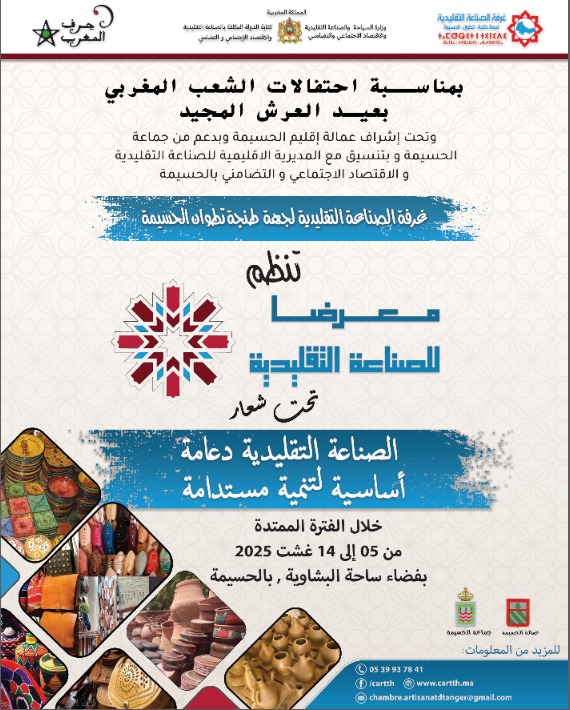 رئيس الغرفة يستقبل مهنيي صباغة المباني بالجهة اجتماع مكتب الغرفة غشت 2025 أصيلة تحتضن معرض الصناعة التقليدية احتفاءً بذكرى ثورة الملك والشعب وعيد الشباب انطلاق فعاليات المعرض الجهوي للصناعة التقليدية بالحسيمة احتفاءً بعيد العرش المجيد النسخة الخاصة لمدينة العرائش من معرض الصناعة التقليدية إعلان عن معرض الصناعة التقليدية – الحسيمة استقبال السيد فيليب تروكيه، القنصل العام لفرنسا بطنجة النسخة الأولى للمعرض الإقليمي المتنقل للإقتصاد الإجتماعي والتضامني بالمضيق إعلان عن طلب عروض مفتوح مبسط رقم 08/2025 إعلان عن طلب عروض مفتوح مبسط رقم 07/2025 المستجدات رئيس الغرفة يستقبل مهنيي صباغة المباني بالجهة المستجدات اجتماع مكتب الغرفة غشت 2025 المستجدات أصيلة تحتضن معرض الصناعة التقليدية احتفاءً بذكرى ثورة الملك والشعب وعيد الشباب المستجدات انطلاق فعاليات المعرض الجهوي للصناعة التقليدية بالحسيمة احتفاءً بعيد العرش المجيد