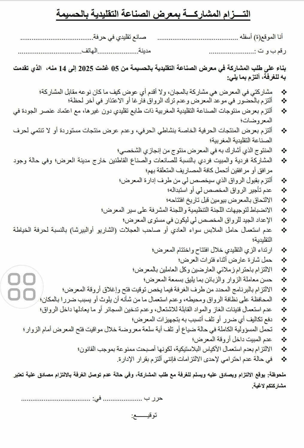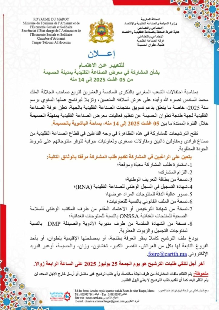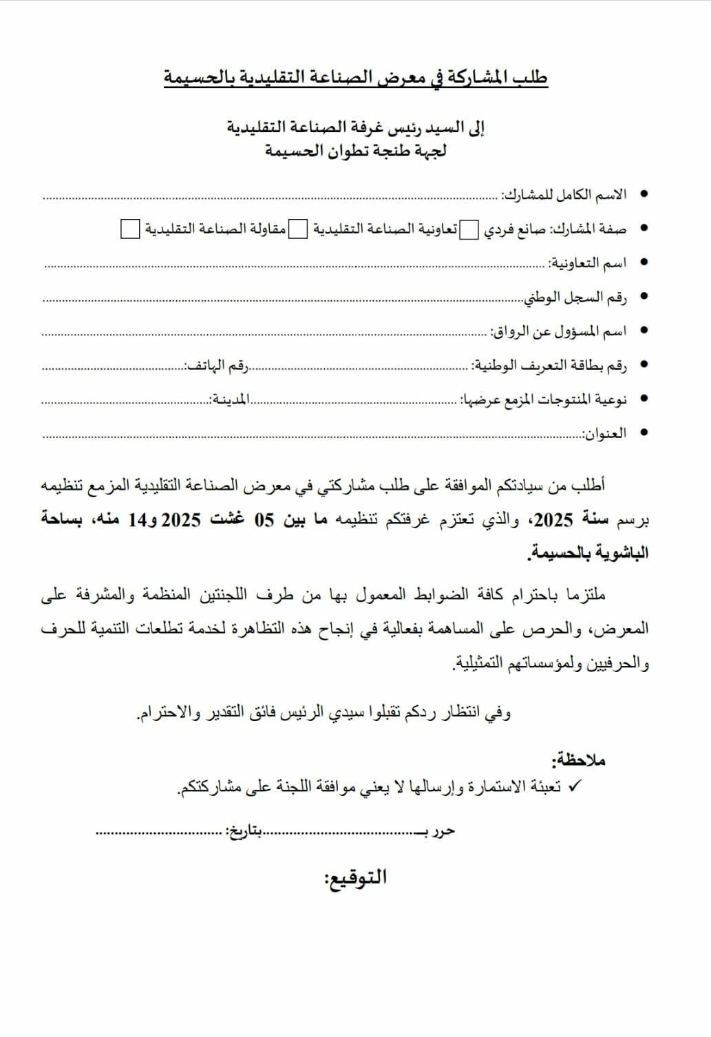 إعلان عن معرض الصناعة التقليدية – الحسيمة 23 يوليو 2025 طلب المشاركة في معرض الصناعة التقليدية بالحسيمة التزام المشاركة بمعرض الصناعة التقليدية بالحسيمة